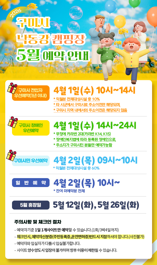 구미시낙동강캠핑장 5월 예약안내 구미시낙동강캠핑장 5월 예약안내1. 구미시 전입자(1년...
